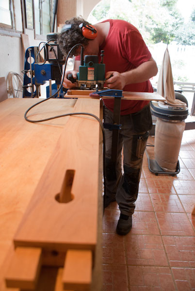 Collage des 3 pièces de la presse à l'aide de lamelles, puis dégauchissage, ajout d'une emboiture et mise en place sur l'établi.